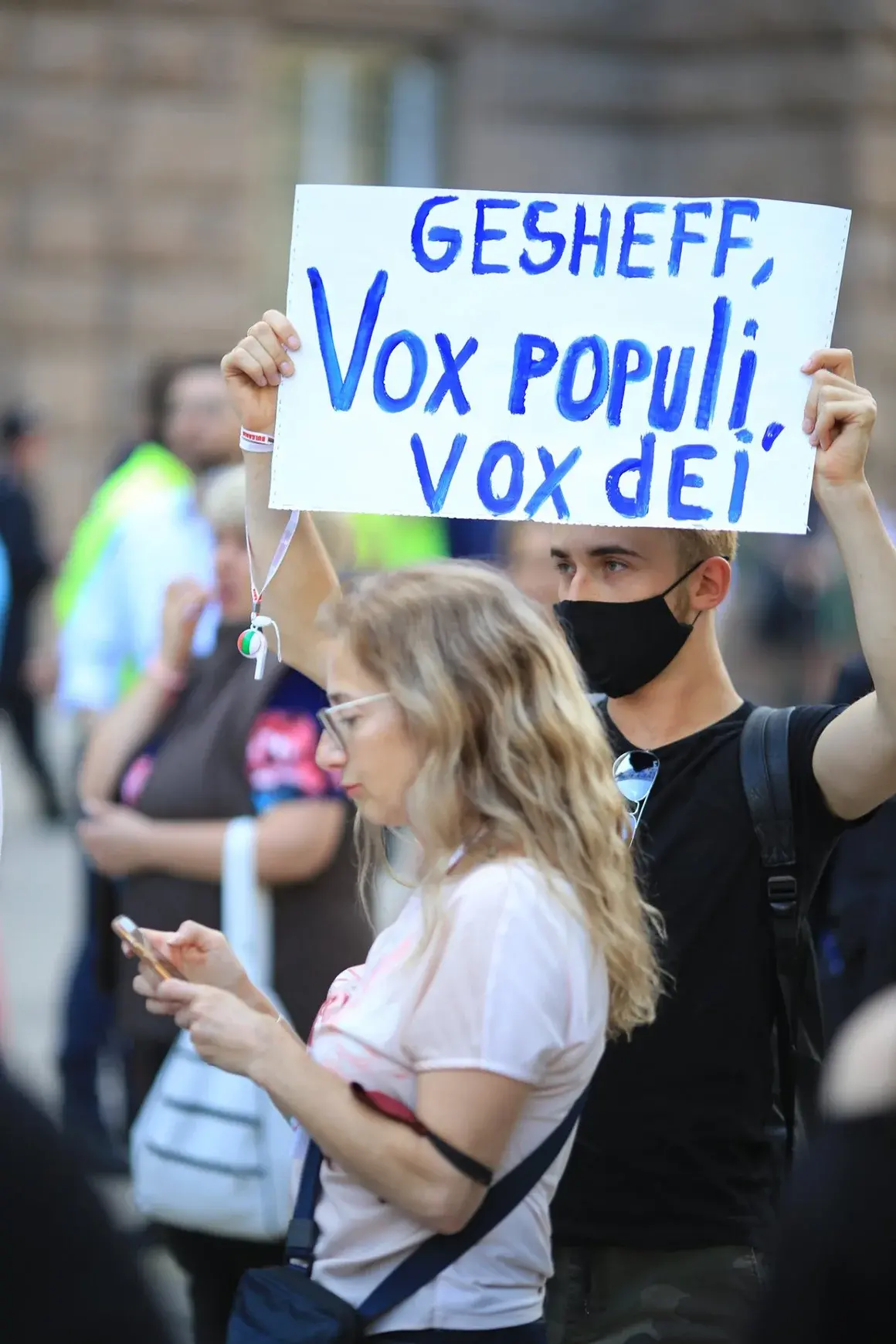 Протестиращите припомнят на главния прокурор Иван Гешев известната латинска поговорка "Vox populi vox Dei", която означава "Глас народен - глас Божи".
