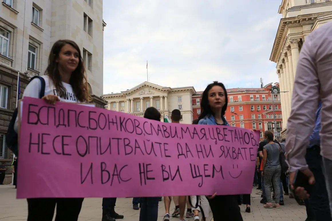"Мая и БСПеевски - вие не сте промяната" - пишат протестиращите.