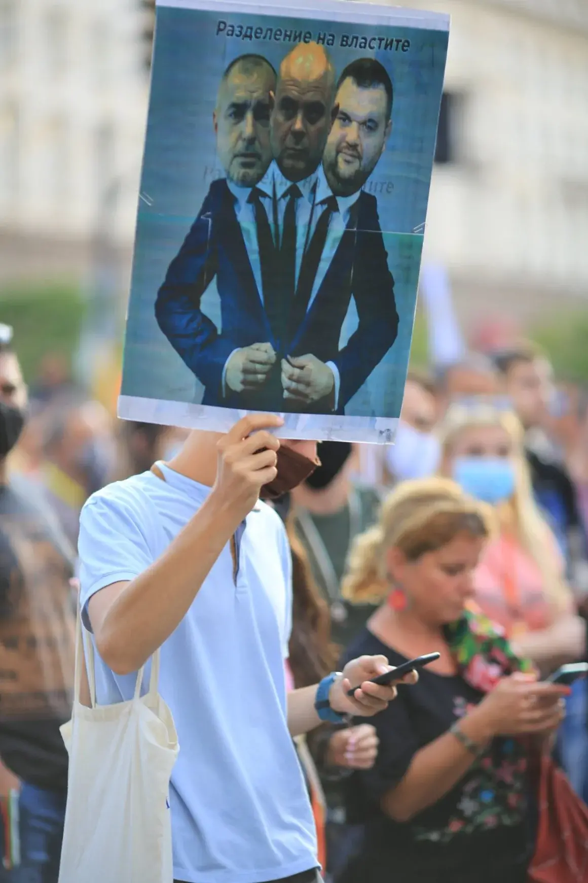 Ето какво е разделението на трите власти в България според протестиращите - Бойко Борисов, Делян Пеевски и Иван Гешев.