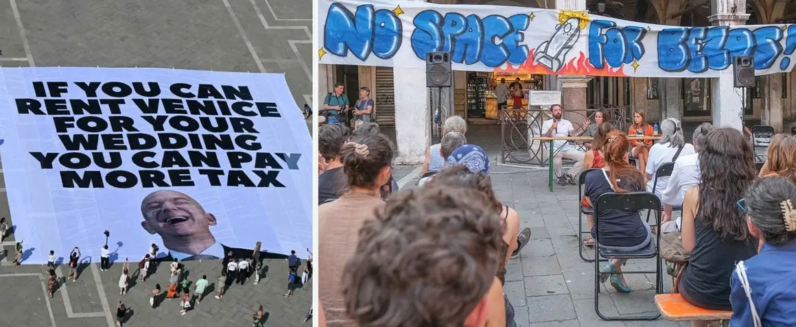Те разпънаха транспарант на площад „Сан Марко“ с изображение на Безос, който се смее, и надпис: „Ако можеш да наемеш Венеция за сватбата си, можеш да плащаш и повече данъци.“