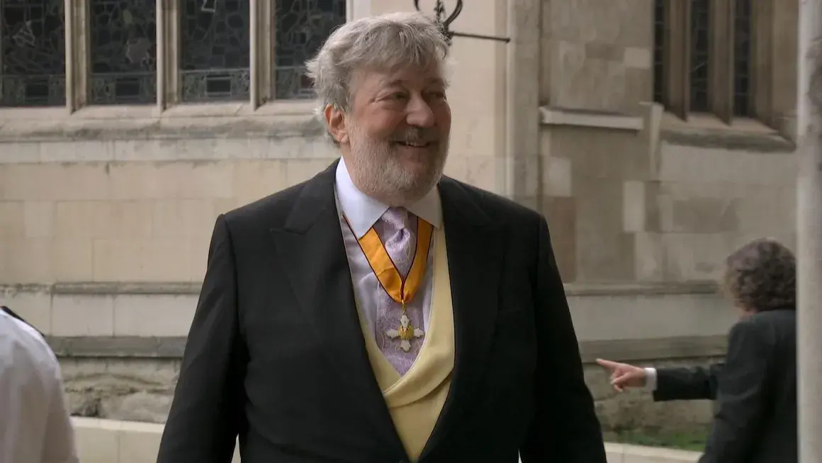 Актьорът и писател Стивън Фрай пристига в Уестминстърското абатство.