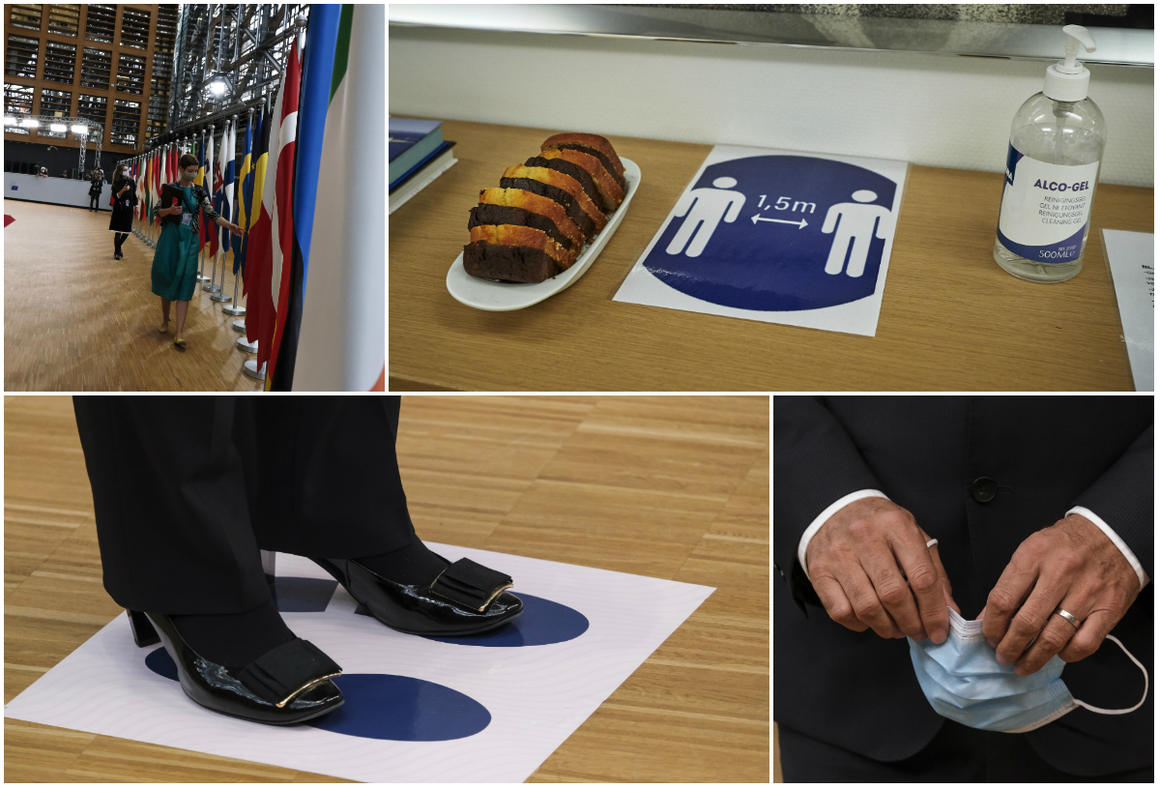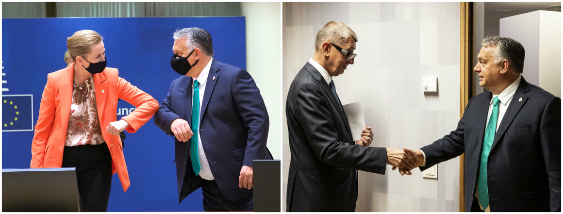Носенето на маски се оказа пожелателно за някои от правителствените ръководителите - премиерът на Унгария Виктор Орбан беше в "пълно снаряжение" за заседанието на 27-те (на снимката вляво се поздравява с колегата си от Дания Мете Фредриксен). Малко по-рано обаче Орбан участва в неформална среща на лидерите от Вишеградската четворка, където нито той, нито който и да е друг от участниците носеха предпазни маски. Ръкостискането все още не е излязло от употреба.