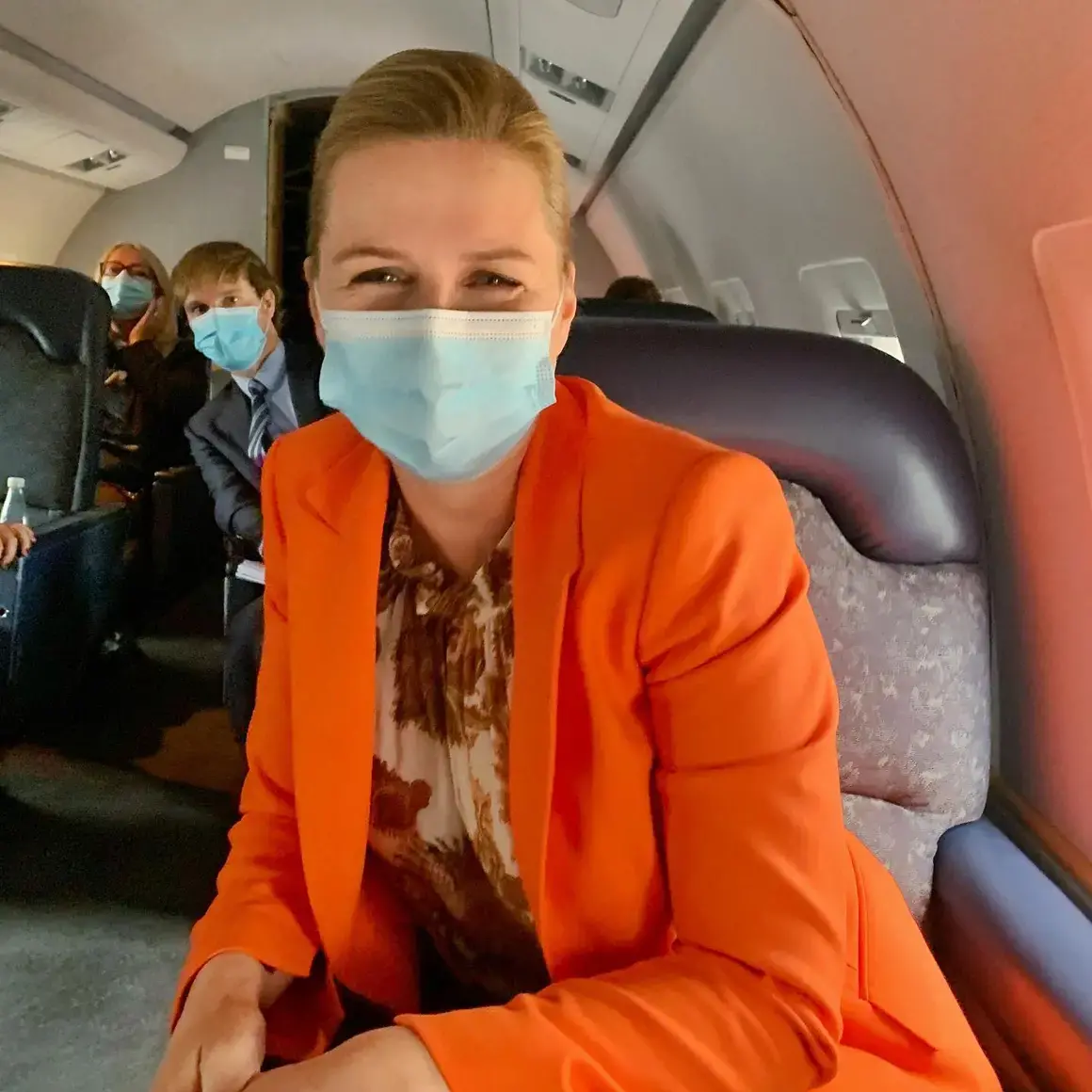 Датският премиер Мете Фредериксен, която отлагаше три пъти сватбата си с режисьора Бо Тенгберг и в крайна сметка сключи брак с него само преди 2 дни, също се снима от самолета: "Меден месец на път за Брюксел"