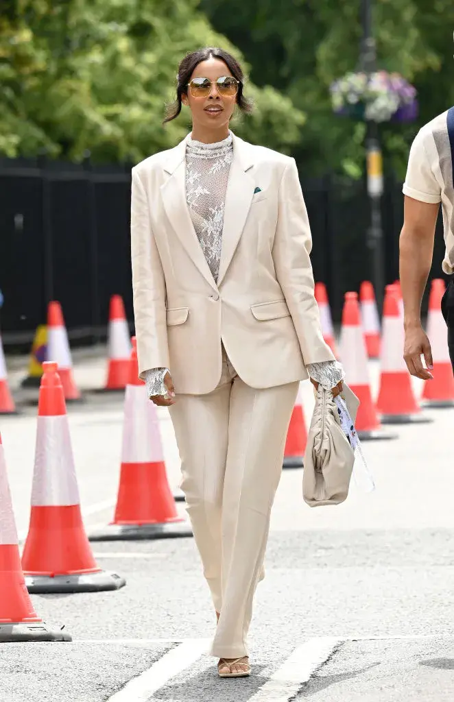 Певицата Рошел Хюмс избра екстравагантна визия – с дантелени ръкави, покриващи ръцете ѝ, плюс сако и панталон в светли цветове.
