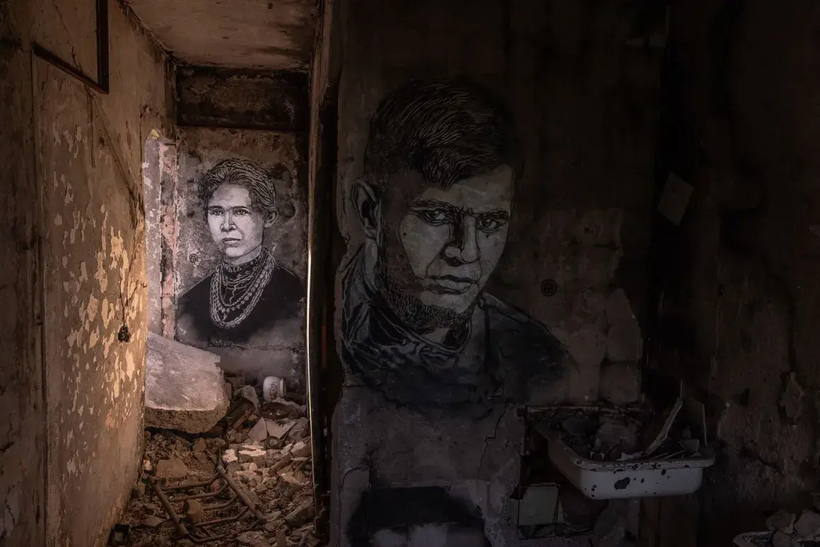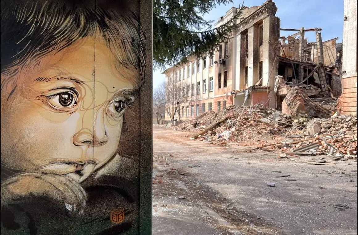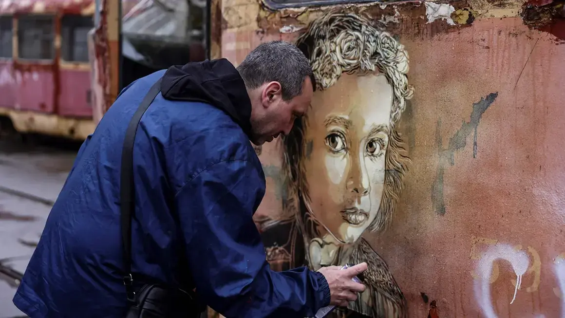 Артистът дори рисува собствения си син Габин, облечен в традиционна украинска риза, върху сграда в Киев, разрушена от руска ракетна атака.