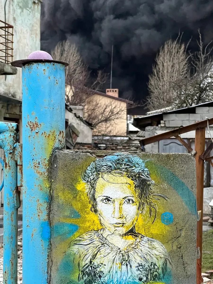 Стенописът е дело на френския уличен артист Кристиан Гюми, известен като C215, и е една от многото творби, които той създава, за да отбележи съпротивата на Украйна срещу руската инвазия.