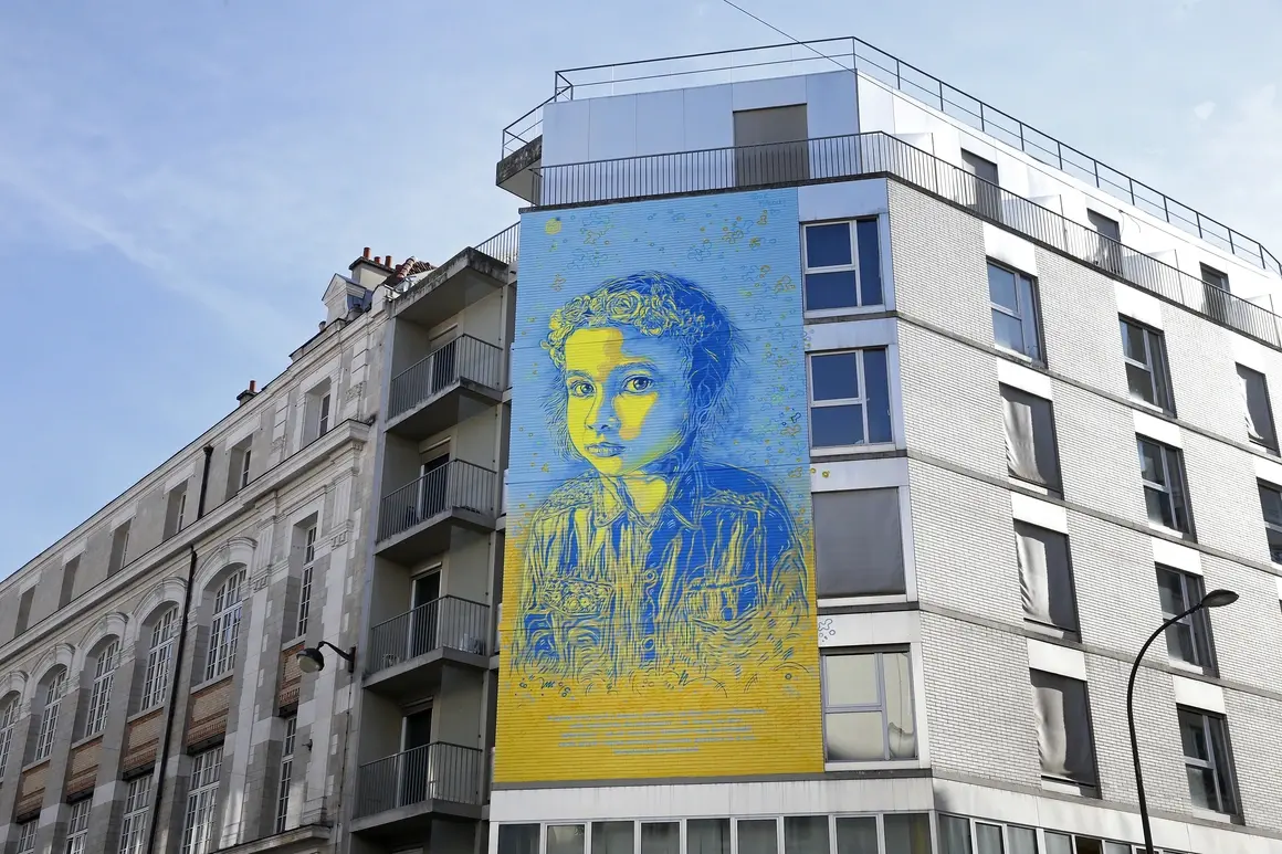 Първият му голям проект след руската инвазия е в подкрепа на украинските бежанци - стенопис в синьо и жълто на украинско момиче с корона от цветя в косата.
