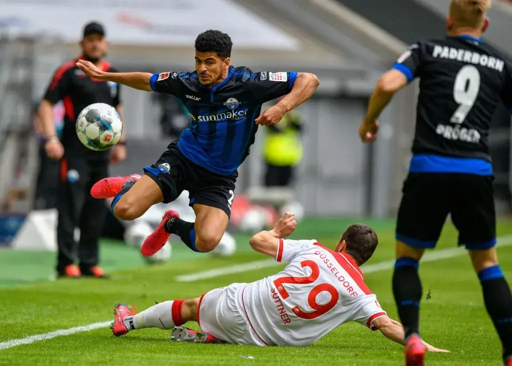 Маркус Сутнер от "Фортуна" в единоборство с Мохамед Дрегер от "Падерборн". Двубоят завърши при нулево равенство.