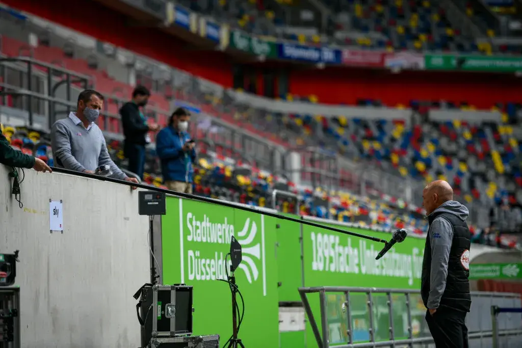 Мениджърът на "Фортуна" (Дюселдорф) Уве Рьослер дава интервю преди началото на домакинския мач срещу "Падерборн". Забележете, че интервюиращ няма.