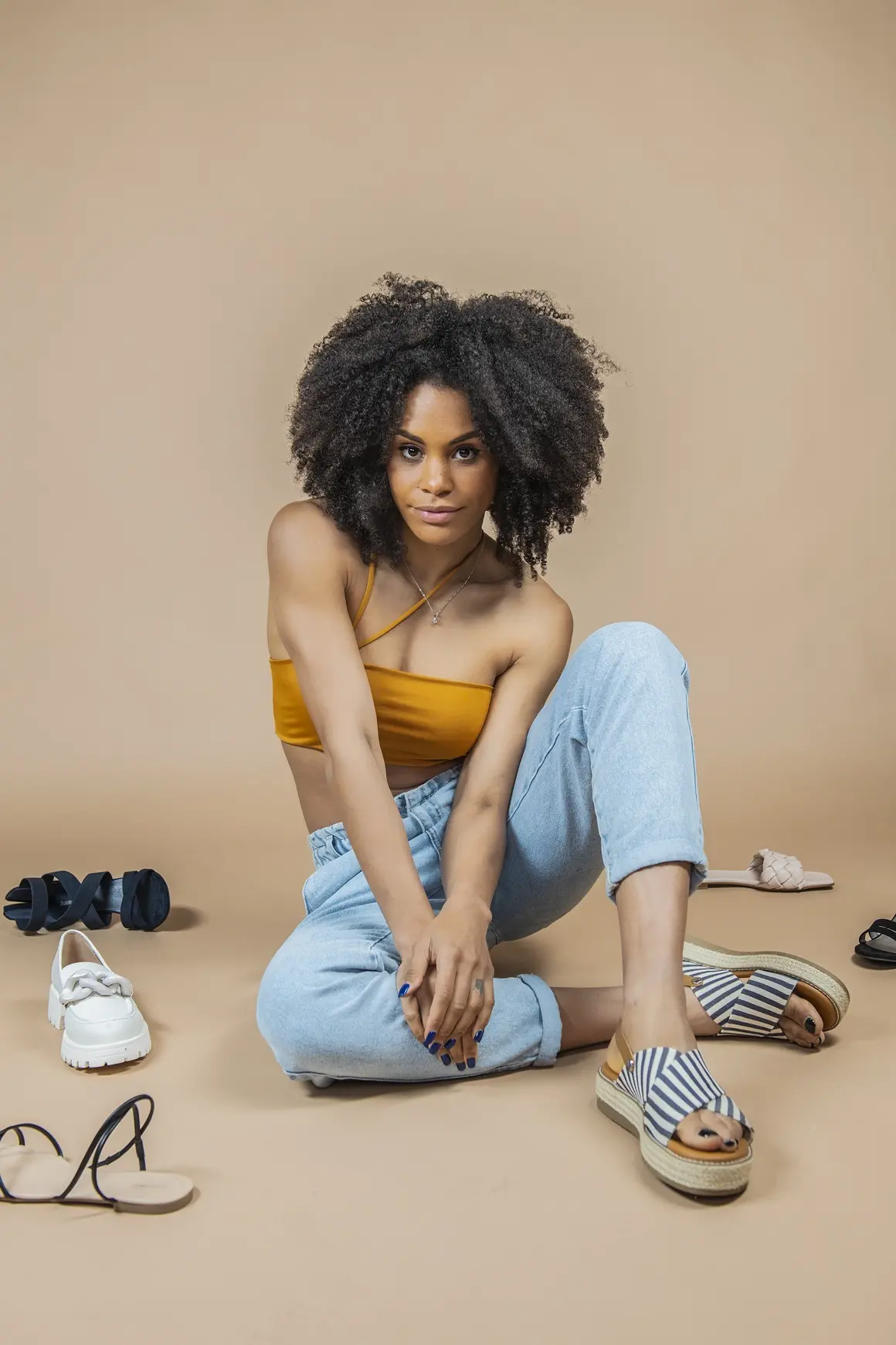 Кари го съчетава с чифт сандали на малка платформа и бяло-сино райе. Идеални за разходки близо до морето и за зареждане с добро настроение. Стоят еднакво добре с рокля, деним или ленен панталон.