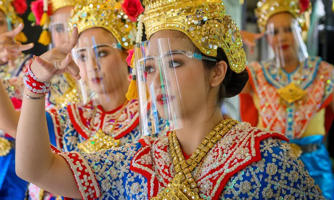 Банкок, Тайланд - местни танцьорки, облечени в традиционни носии, носят предпазни шлемове