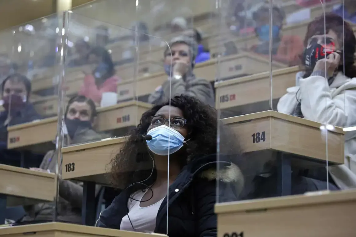 Йоханесбург, РЮА - участници в търг седят в отделни плексигласови кабини
