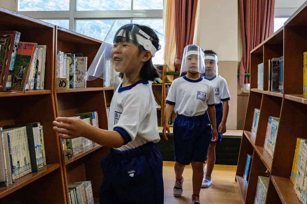 Нико, Япония - деца носят шлемове в училищната библиотека