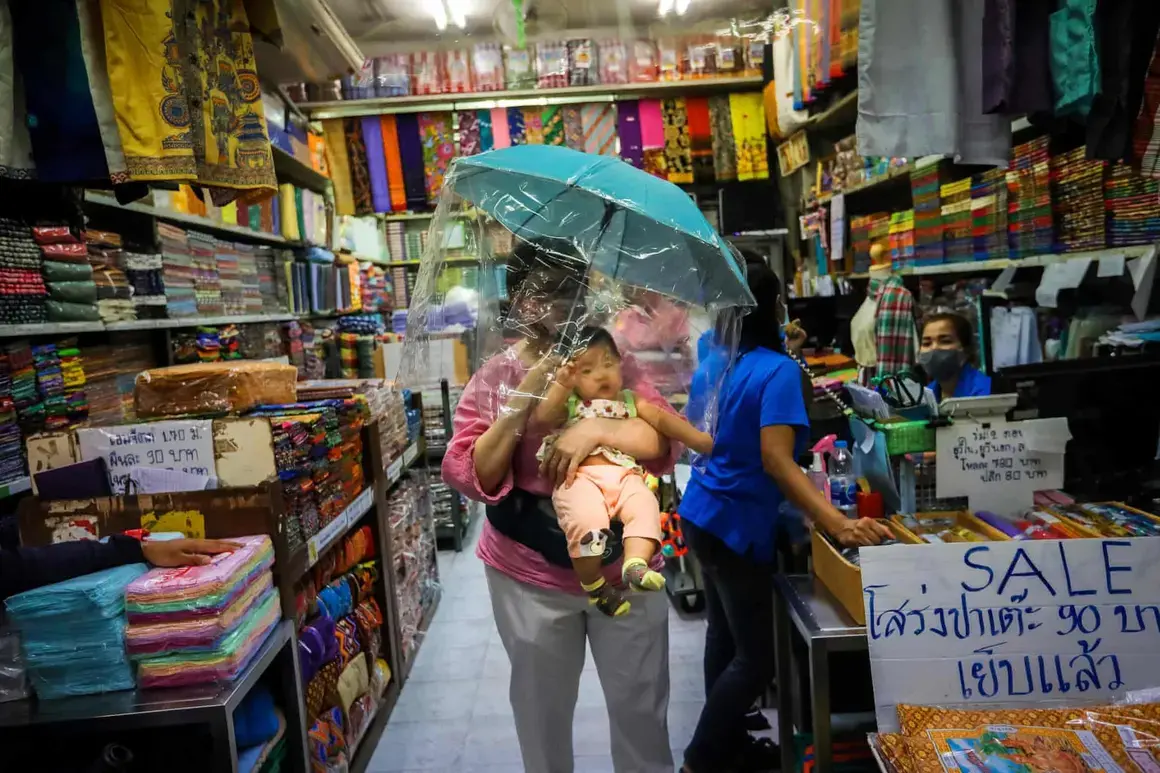Банкок, Тайланд - жена носи новороденото си под специален чадър, за да го защити