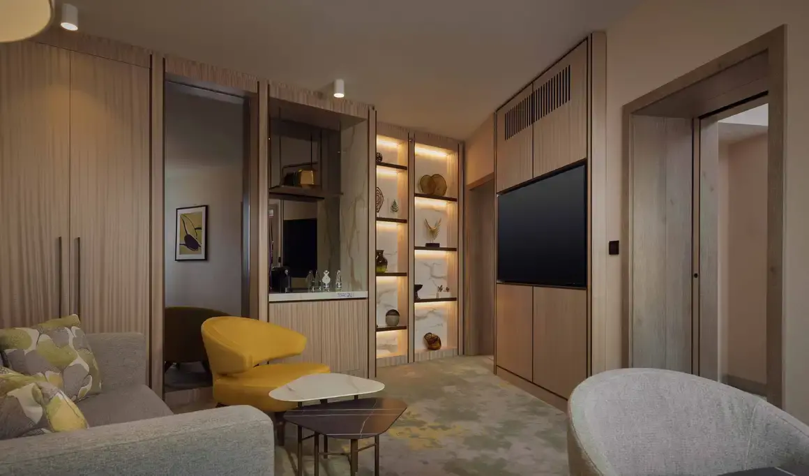 Надникваме и в апартаментите, където са обособени спалня и всекидневна, като е предвиден и самостоятелен кът за хранене. Това не означава, че в стаите няма рум сървиз, а че опциите за хранене в хотела са повече - включително с възможността съвсем гостите по всяко време на денонощието да си купят снаксове и безалкохолни и алкохолни напитки.