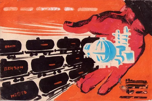 Скица за постер на Виктор Мекантиев от 1976 година, която представя ръка, държаща рафинерия за бензин, нефт и спирт.
