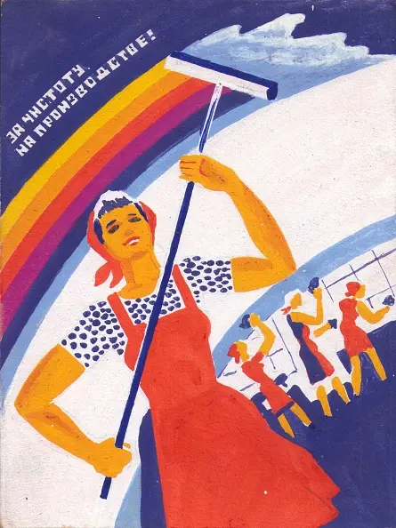 Тук наблюдаваме скица за постер на Виктор Мекантиев от 1988 година, на която пише "За чисто работно място".