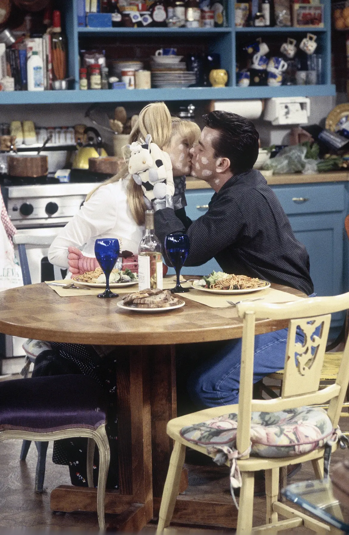 Сюжетът на разговора и реакциите на актьорите от Приятели са без сценарий - Мат Леблан (Джоуи) спонтанно се намесва, питайки дали Кристал е въпросният гинеколог, при което Кристал отвръща през рамо, че водят личен разговор.