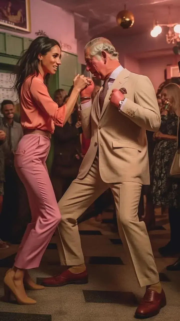 В света на Мейсън очевидно кавгите между роднините не съществуват, затова засичаме Чарлз и Меган Маркъл - съпругата на принц Хари, да танцуват - сцена, която никога не бихме видели в реалния живот.