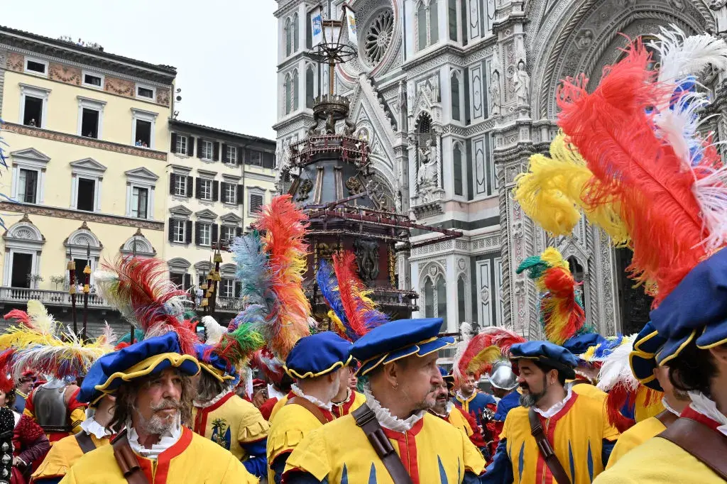 Празничната процесия в италианския град завършва със зрелищно запалване на фойерверките пред най-голямата катедрала "Санта Мария дел Фиоре", позната още като Дуомо.