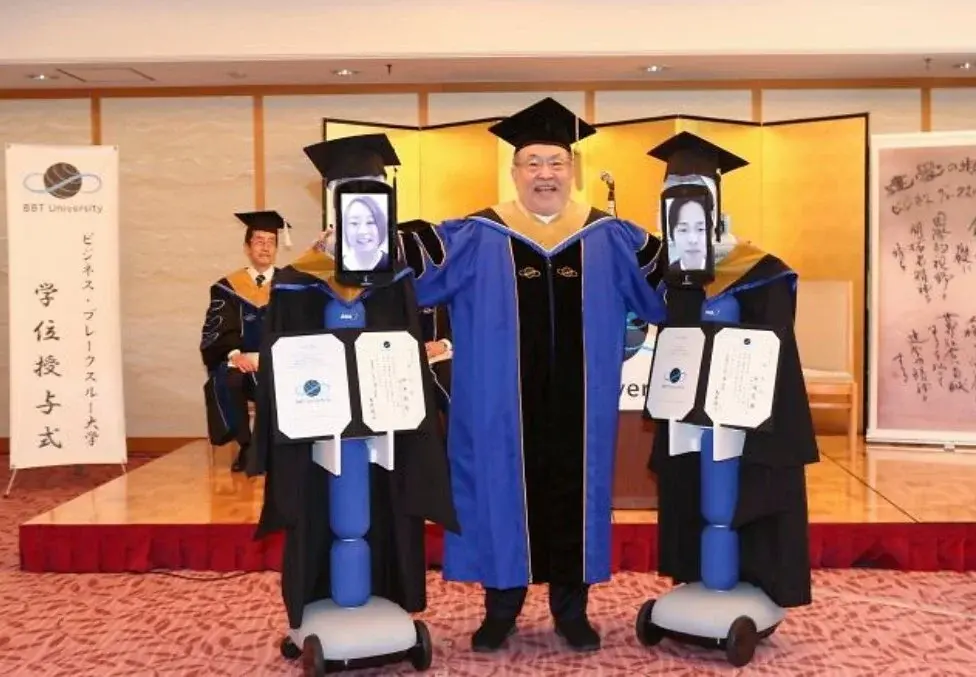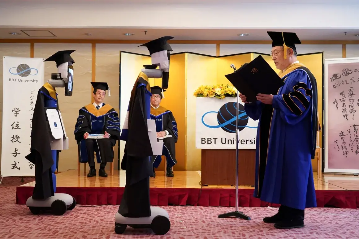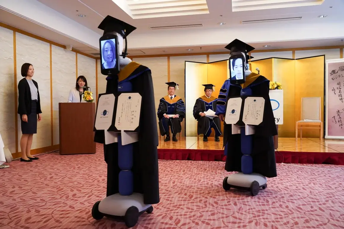 Те се включиха в церемонията онлайн чрез платформата Zoom, а физическите им представители в университета бяха роботи, облечени с тоги и шапки.