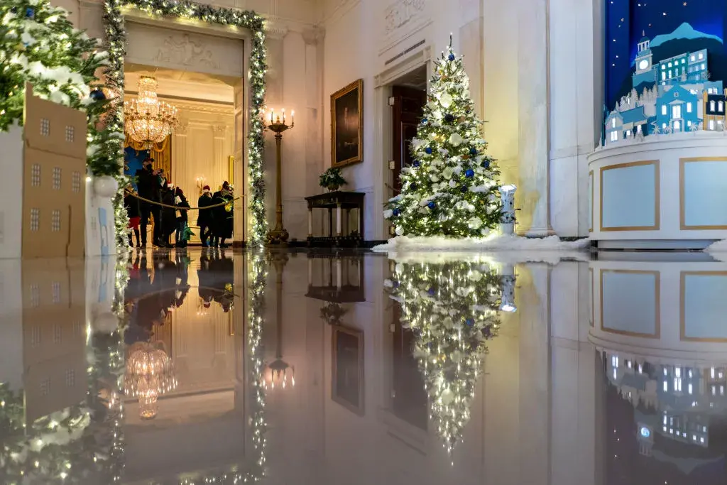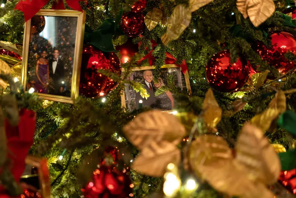 На друга от елхите там са окачени снимки на настоящата президентска двойка на САЩ - Джо и Джил Байдън, както и на предходните двойки като Барак и Мишел Обама.