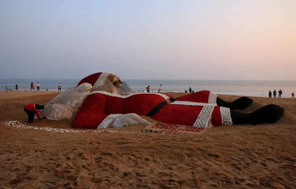 В източния индийски щат Ориса скулптура на дядо Коледа е положена на пясъка около Бенгалския залив.