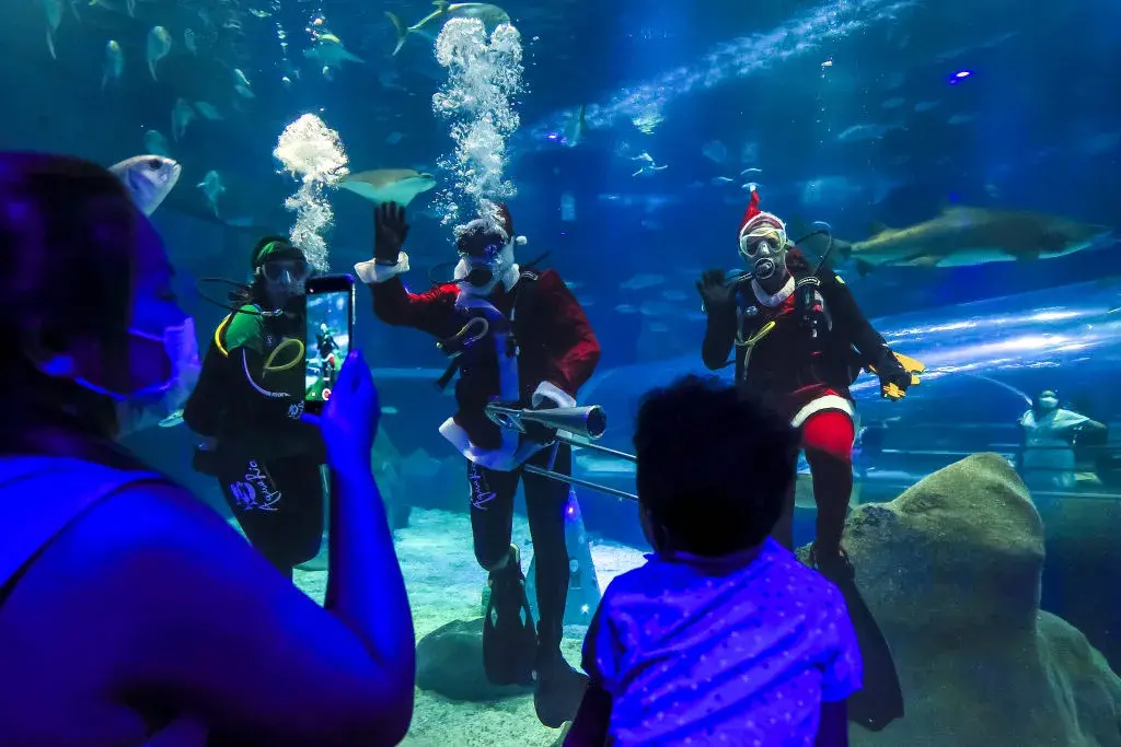 В огромния аквариум AquaRio в Рио де Жанейро (Бразилия) посрещнаха Коледа по нетрадиционен начин - с водолази, преоблечени като брадатия старец.