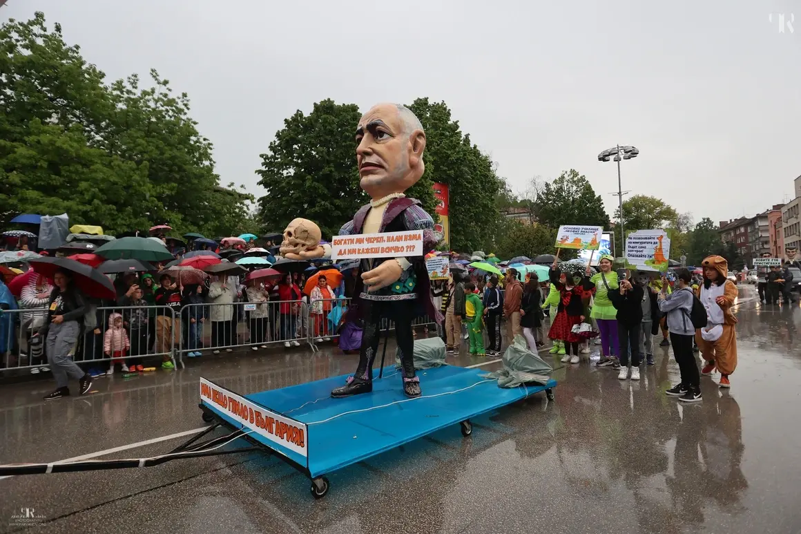 Иван Гешев явно е усетил, че ще вали в Габрово, затова си е сложил каскет. Той бе изобразен с кокошка в ръка и със списък „КТБ“.