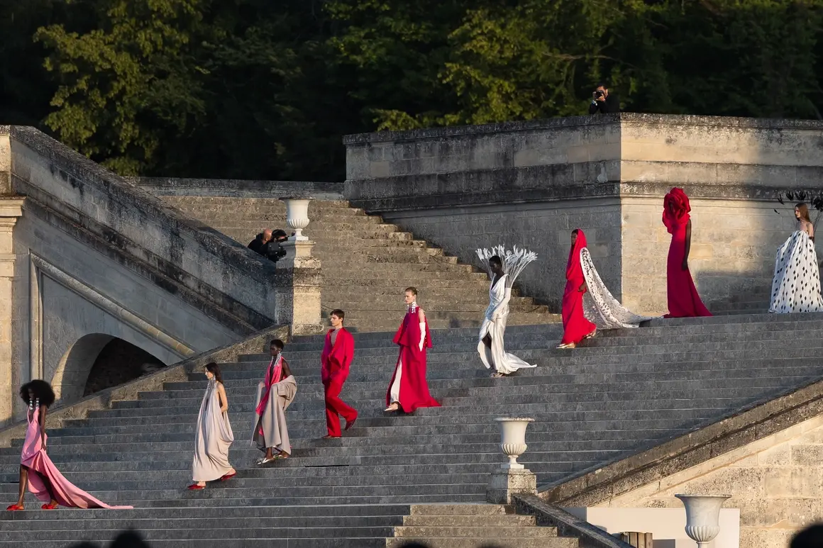 Моделите излязоха от величествения замък, слязоха по стълби и заобиколиха централния фонтан, така че колекцията на дизайнера Пиерпаоло Пичоли да може да се види от всички ъгли. Те носеха рокли, палта и пелерини - обемни на външност, но леки като материи, съчетани с богати декорации от пера и скъпоценни камъни.