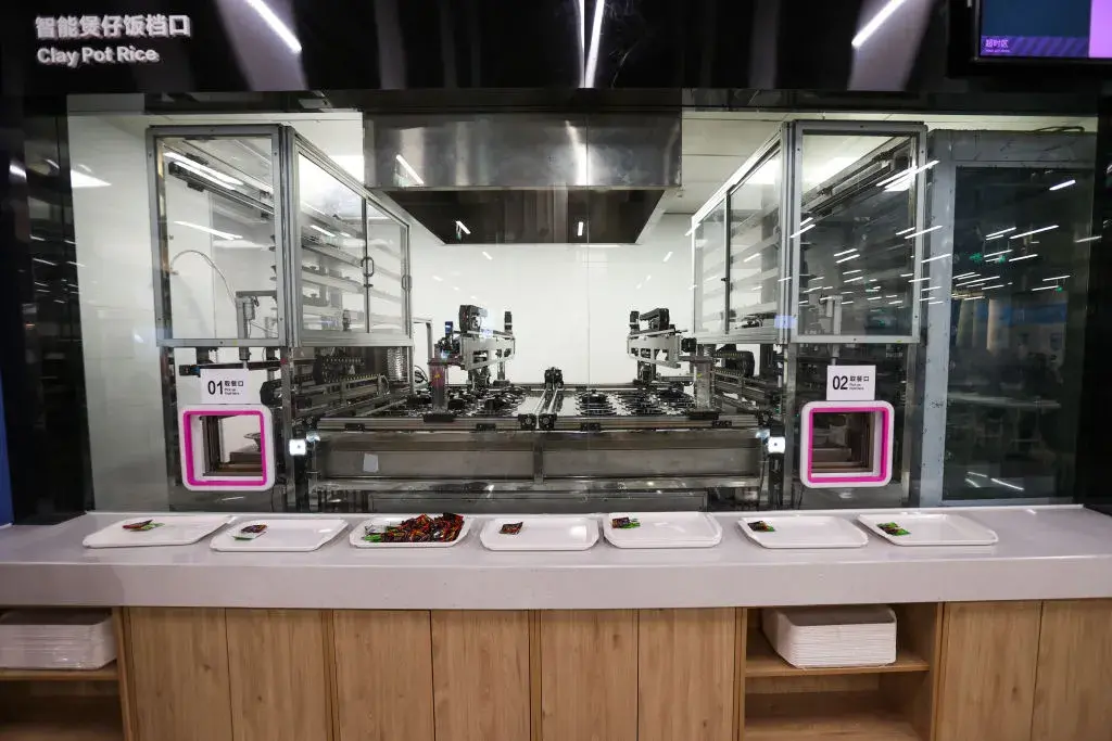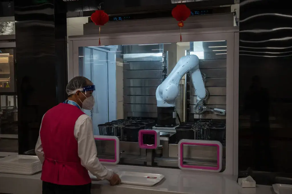 В кафетерията за представители на медиите например от тавана висят роботи, които сервират подбрани ястия, докато други техни „колеги“ всъщност готвят храната.
