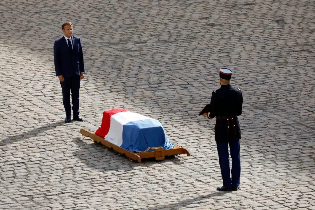 Хиляди гледаха церемонията, която по мащаба си напомни за поклонението пред бившия президент Жак Ширак, починал през 2019 г.