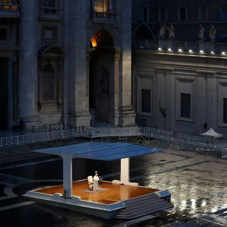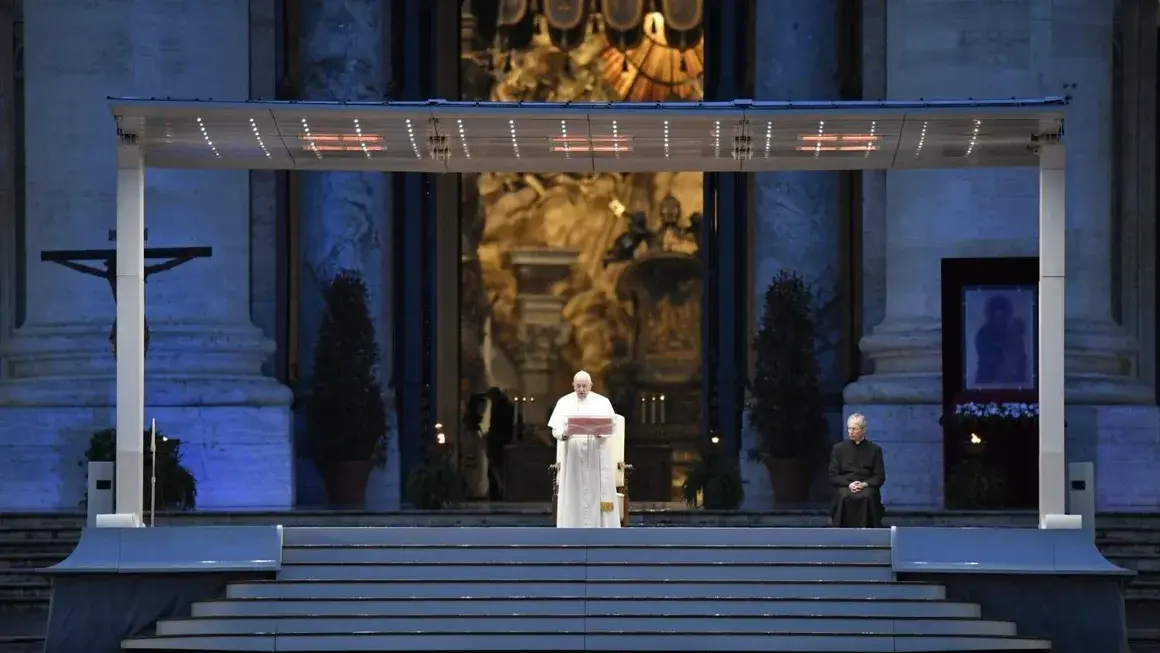 Стоейки на пустия площад „Свети Петър“, под постоянен дъжд, папа Франциск говори пред света чрез всички средства на съвременната комуникация: Facebook, YouTube, телевизия и радио.