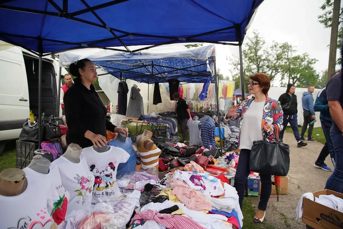 Междувременно в Сърница: Кандидат-депутатът на "Демократична България" Антоанета Цонева на среща с местната общественост по рокля, кецове Conversе и забрадка.