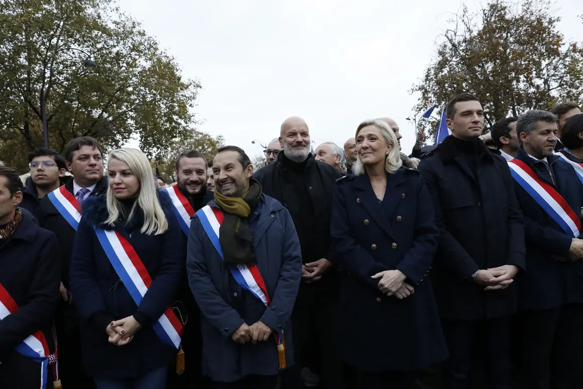 Марин льо Пен присъства на марша в неделя на фона на нарастващи критики към партията ѝ, че не е успяла да се отърси от антисемитското си наследство въпреки нарастващата си политическа легитимност.