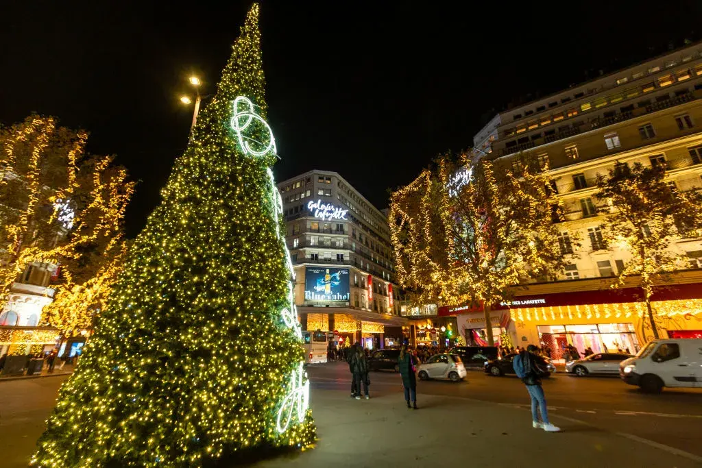 Koледната елха пред Galeries Lafayette e украсенa със светещи гирлянди.