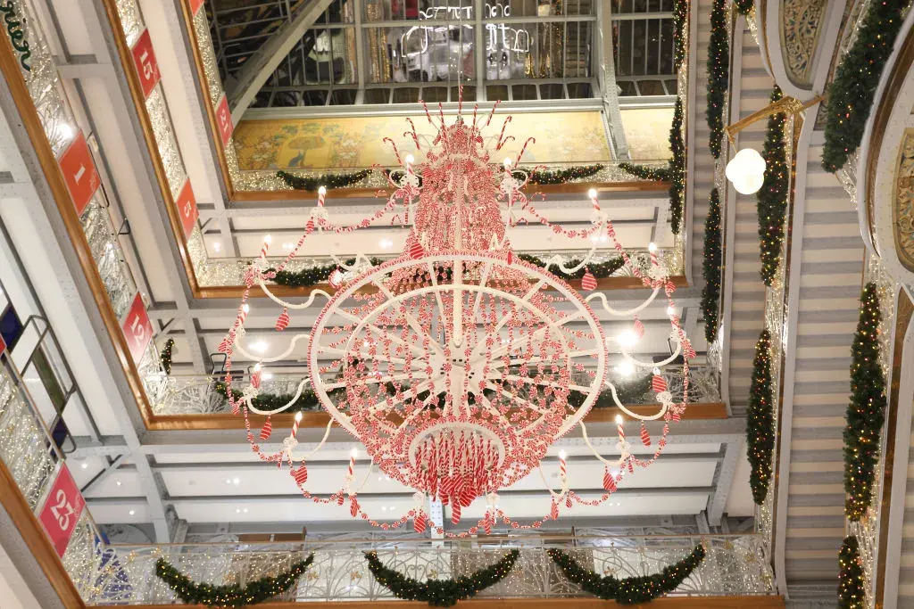 Поглед към украсата на "La Samaritaine" и полилеят с цветове на коледни бонбони - още един от големите търговски центрове в Париж, в който Коледа вече е дошла.