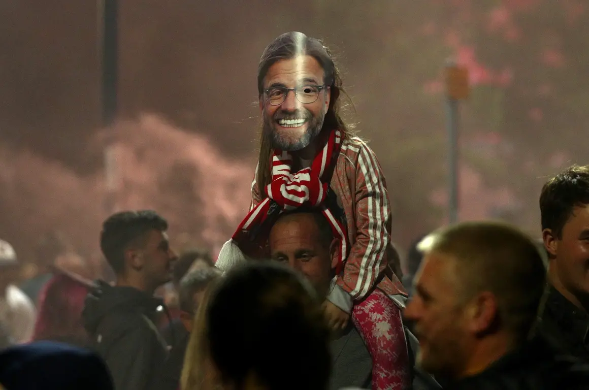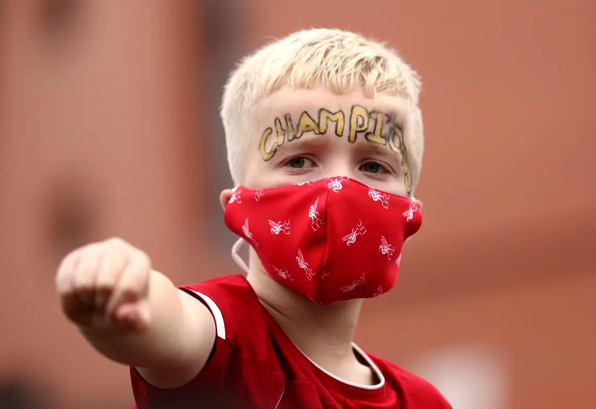 Дете с маска на Юрген Клоп върху раменете на баща си: мениджърът на отбора обеща на поддръжниците си "парти", с което да отпразнуват успеха от сезон 2019/2020, но засега не е ясно кога и как ще може да се случи.
