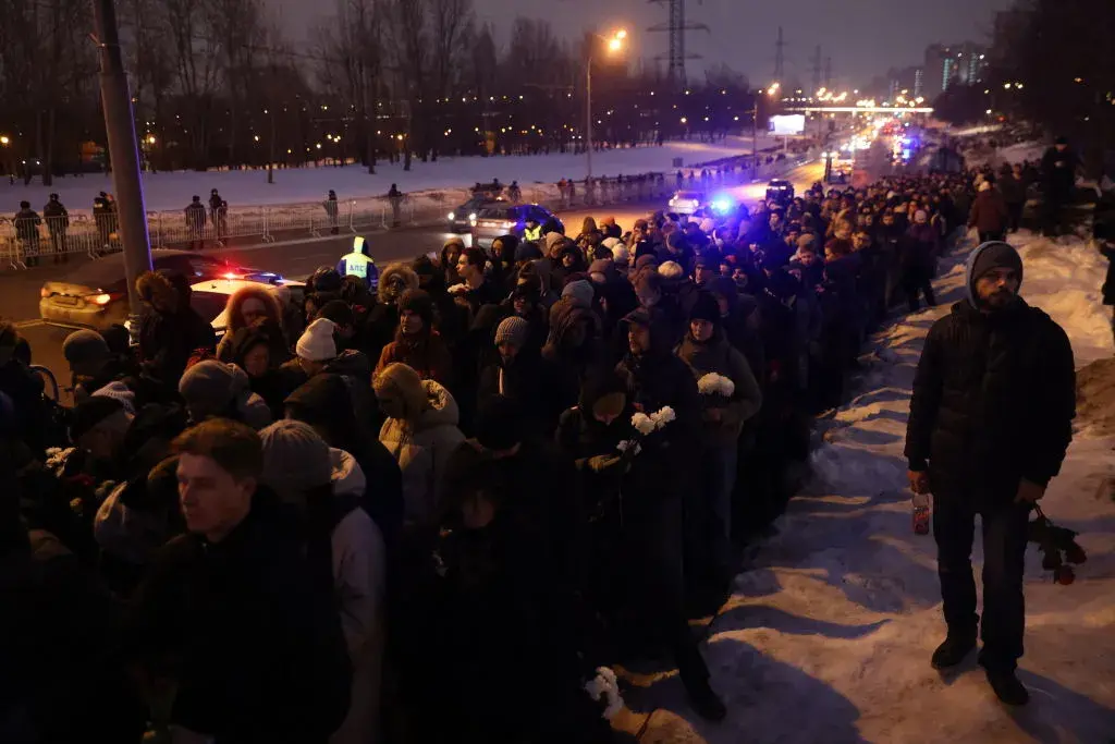 Въпреки предупрежденията на Кремъл за арести, две седмици след като най-известният критик на Владимир Путин загина, хиляди опечалени се събраха в Москва, за да се сбогуват с Алексей Навални.