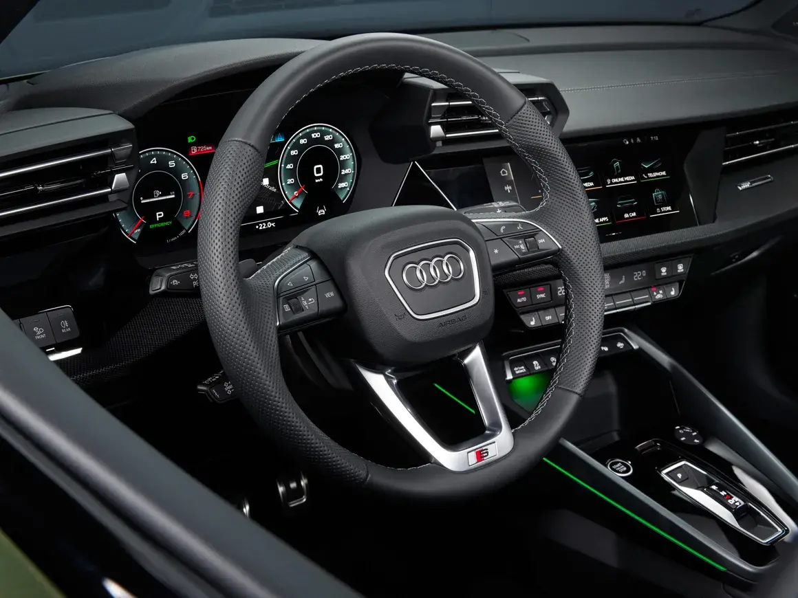 Преденният спойлер свързва двата въздухозаборника и създава за ниска визия на Audi A3. Същото важи и за задната част, която е особено спортна с новата си броня и отличителен дифузьор. Отчасти вдъхновени от моделите RS, прогресивните дизайнерски елементи са особено ефективни в комбинация с екстериора S line. Новите, експресивни екстериорни цветове District Green, Ascari Blue и Progressive Red подчертават динамичното излъчване.