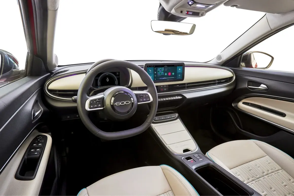 Fiat (600e)RED приема червения цвят като отличителен белег, както отвън (от каросерията до предните и задните лога) така и отвътре (панела на арматурното табло и елементите на седалките от рециклиран текстил).