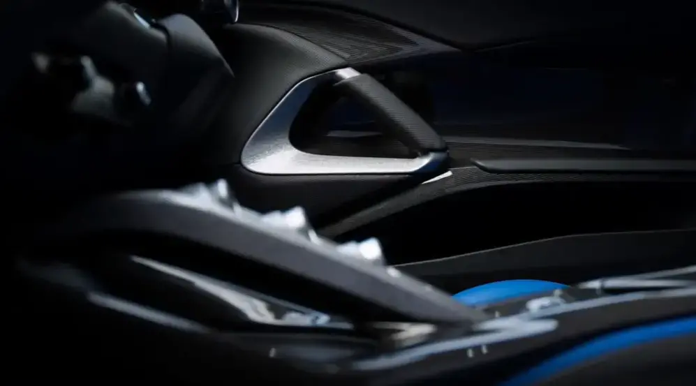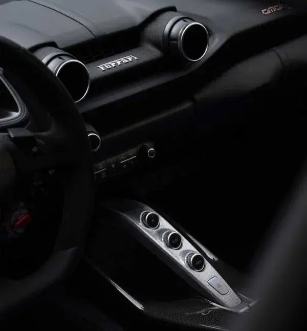 Във вътрешната част забелязваме сини седалки, напомнящи на легендарната серия 250 GTO. Те са направени от синя кожа и плат Jeans Aunde. Сребристите акценти, които по принцип са стандарт, са заменени с изцяло черни, а вътре можем да видим още елементи от алуминий и карбон.