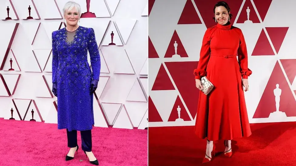 Клоуз носеше синя рокля на Armani в Лос Анджелис, докато 47-годишната британка показа червената си рокля в специалния хъб, направен от организаторите в Лондон. Тя не успя да пътува до САЩ, но имаше възможността да стъпи на червения килим, макар и на друг континент.