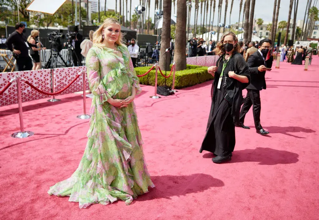 Тя е бременна в седмия месец, като съвсем скоро се очаква да роди второто си дете. На червения килим Фенел се появи със зелено-розова широка рокля на Gucci.