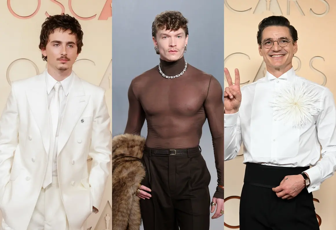 Мъжете на "Оскарите" - Тимъти Шаламе в бяло, Конър Стори от Heated Rivalry с кожена наметка и прозрачен топ, Педро Паскал с огромна декоративна брошка във формата на цвете вместо папийонка или вратовръзка.