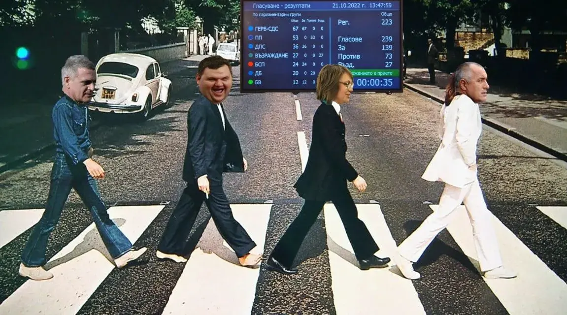 Въпросното мнозинство, олицетворено от най-ярките си политически фигури, бе уважено по достойнство с римейк на легендарната обложка на албума "Аби Роуд" на "Бийтълс".