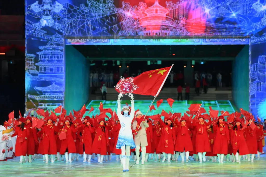 След това на арената се появи знамето на Китай, което премина през ръцете на дълга колона от хора - представители на 56-те етнически групи от всички части на страната.