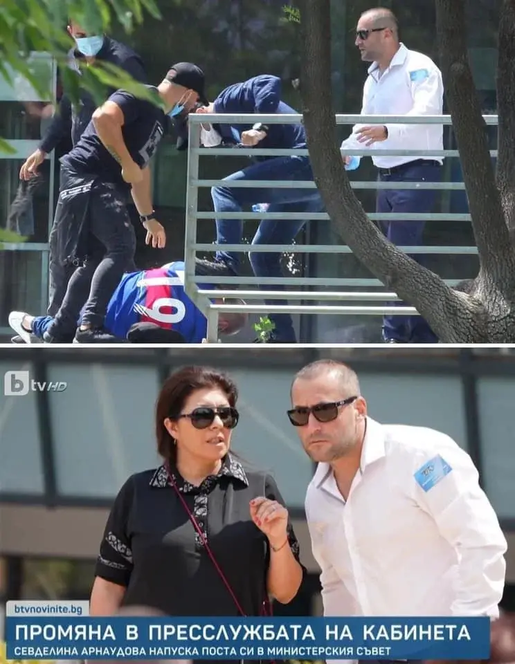 Междувременно - извън обективите на акредитираните медии, които излъчваха на живо от сцената - започнаха да се развиват изключително грозни сцени. Маскирани мъже, някои от които с баджове "ГЕРБ", се сблъскаха с протестиращите. Официалната охрана, която "София тех парк" е трябвало да осигури на място, не се намесваше в боя. Журналисти, сред които репортерът на "Свободна Европа" Полина Паунова, заснеха извършителите на нападенията - само за да станат жертва на агресия. Телефонът на Паунова беше блъскан и хвърлян от агресорите. Самоличността им така и не беше установена.