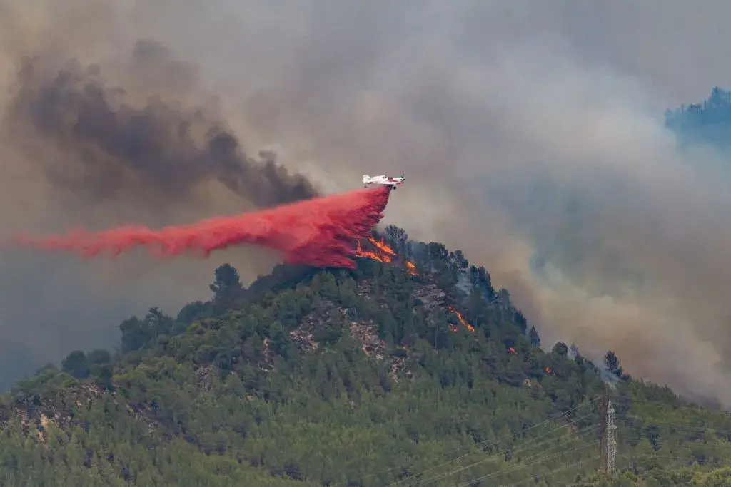 Самолет опитва да ограничи горски пожар на възвишение край Барселона. 13 въздушни екипа на пожарната са ангажирани за справянето с кризата.