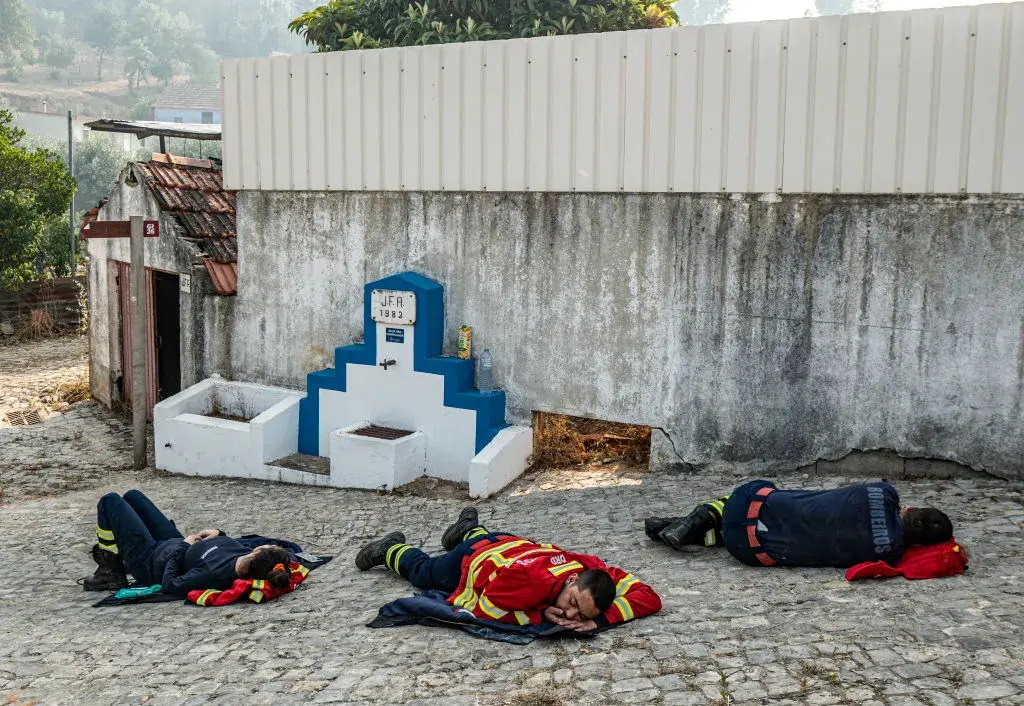 Португалски пожарникари спят на земята, след като са работили цяла нощ по овладяването на огъня.
